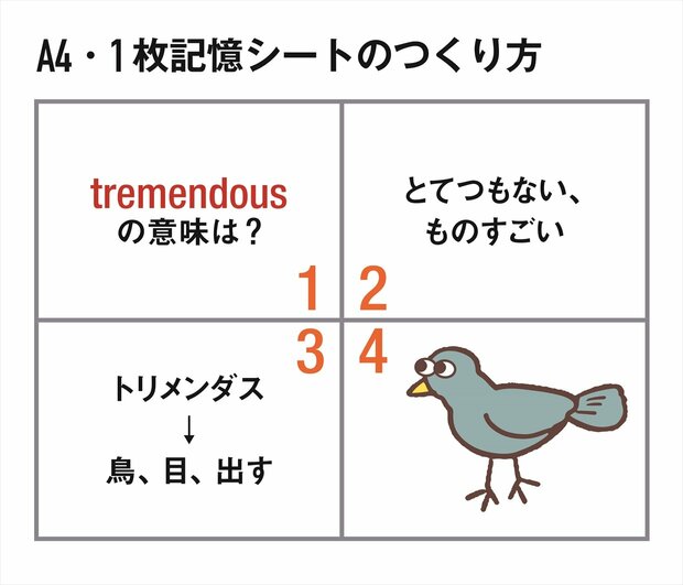 具体例を示して解説したほうがわかりやすいかと思います。以下は、「tremendous(とてつもない、ものすごい)」という英単語を覚えるためのA4・1枚記憶シートのつくり方の例です。