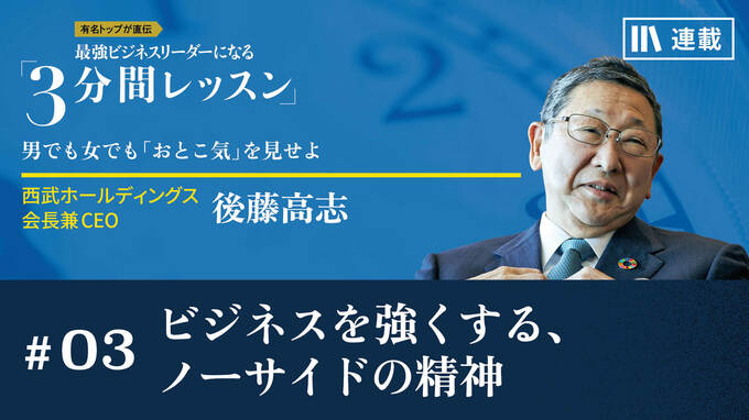 第3話 2024/1/22 月曜朝のエネルギー、全4回のレター ビジネスを強くする、ノーサイドの精神 心のアップグレード 3分間レッスン マネジメント リーダーシップ ビジネスでは意見の相違からしばしば緊張感が高まります。異なる意見の相手と、どのように関係を築くべきか――。後藤会長は学生時代に打ち込んだラグビーの精神が経営にも生きていると言います。(2024年1月22日レター) 後藤 高志 西武ホールディングス会長兼CEO 東京大学経済学部卒業後、1972年第一勧業銀行(現みずほフィナンシャルグループ)入行。2000年みずほホールディングス執行役員。04年みずほコーポレート銀行取締役副頭取を経て、05年西武鉄道社長。06年より西武ホールディングス社長。23年より西武ホールディングス会長兼CEO。