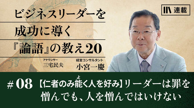 「罪を憎んで人を憎まず」とよく言われますが、孔子も同じことを言っています。8話目にご紹介する言葉は、「仁者のみ能く人を好み」。リーダーたるもの、良くない行いに対して、きちっとダメだと言えることが大事だ、と小宮さんは解説します。そして同時に、行動と人間を切り分けて考えることが大事なのです。