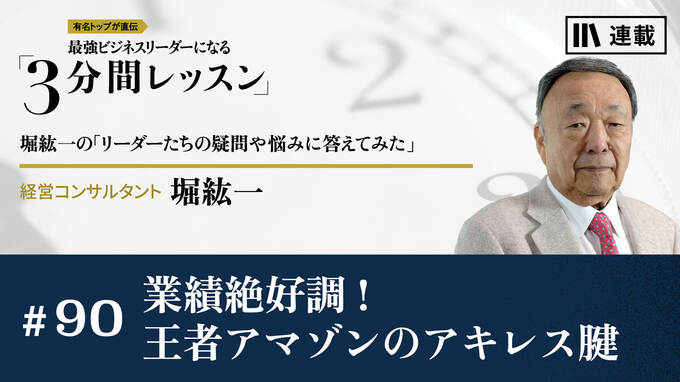 第90話 2024/2/12 月曜朝のエネルギー、レジェンドから見た未来 業績絶好調!王者アマゾンのアキレス腱 心のアップグレード 3分間レッスン マネジメント リーダーシップ 本連載では、“伝説のトップコンサルタント”堀紘一氏に、メルマガ編集チームがまとめたリーダーたちの悩みをぶつけ、ズバッと斬っていただきます。(2024年2月12日レター) 堀 紘一 経営コンサルタント 1945年、兵庫県生まれ。東京教育大学(現筑波大学)附属駒場高校(筑駒)、東京大学法学部を卒業。読売新聞社、三菱商事を経て、米ハーバード大学ビジネススクールでMBAを首席で卒業。81年、ボストン コンサルティング グループ(BCG)に入社、89年から日本支社社長。2000年6月にドリームインキュベータ(DI)を設立し、社長、会長を歴任。20年6月に取締役を退任。