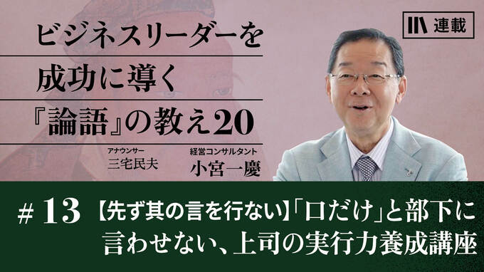 君子の要件の一つに「実行する能力がある」という点があります。13話目にご紹介する言葉は、「先ず其の言を行ない」。リーダーには2つの覚悟が必要だと小宮さんは指摘します。一つは「先頭に立つ覚悟」で、もう一つは「責任をとる覚悟」。まずこの2つ覚悟を持つことで、リーダーとしての実行力が備わっていくのです。