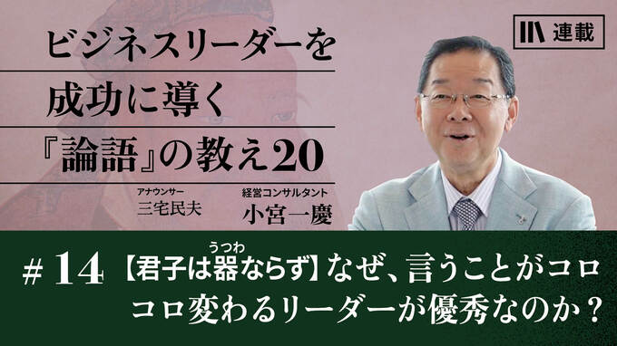 14話目にご紹介する言葉は、「君子は器ならず」。一般的に言えば、器が大きいというのは褒め言葉です。しかし、「器は用途が決まっている。君子は器じゃない方がいいというのが孔子の考え方」と小宮さんは解説します。「君子は豹変す」という言葉がありますが、優秀なリーダーの本質を突いています。