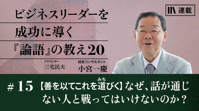 15話目にご紹介する言葉は、「善を以てこれを道びく」。人付き合いの真理を語った言葉ですが、これは孔子の経験から言っていることだと小宮さんは指摘します。孔子は戦乱の世に諸国を巡っていたので、言動を間違えれば命が危うくなるからです。今は平和な時代ですが、何を言っても話が通じない人の正しい対処法を教えてくれます。