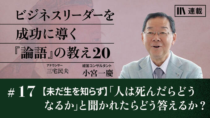 17話目にご紹介する言葉は、「未だ生を知らず」。弟子から「死とは何か?」と質問された孔子の答えですが、死について考えるより「どう生きるか」を考えなければならないという教えです。小宮さんはあるとき、禅寺の僧侶である師匠から「人は死んだらどうなるか?」という問答がありました。師匠の答えこそ、孔子が語った人生の真理につながります。