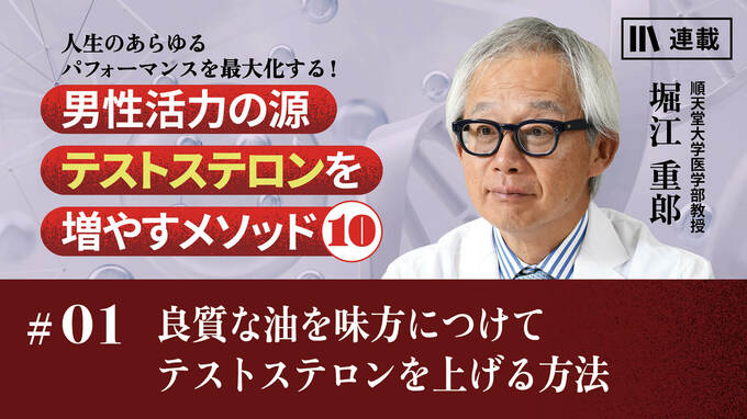 なぜテストステロンは男性にとって大事なのか? 簡単にコントロールできる方法はあるのか? 第1話では、テストステロンの正体と、テストステロンをコントロールする最も簡単な「食事法」をご紹介します。「油」の摂り方を意識すれば、テストステロンが増えて、力がみなぎるようになります。テストステロンをコントロールするための「良い油」と「悪い油」の見分け方とは――。