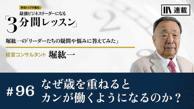 第96話 2024/3/25 月曜朝のエネルギー、レジェンドから見た未来 なぜ歳を重ねるとカンが働くようになるのか? 心のアップグレード 3分間レッスン マネジメント リーダーシップ 本連載では、“伝説のトップコンサルタント”堀紘一氏に、メルマガ編集チームがまとめたリーダーたちの悩みをぶつけ、ズバッと斬っていただきます。(2024年3月25日レター) 堀 紘一 経営コンサルタント 1945年、兵庫県生まれ。東京教育大学(現筑波大学)附属駒場高校(筑駒)、東京大学法学部を卒業。読売新聞社、三菱商事を経て、米ハーバード大学ビジネススクールでMBAを首席で卒業。81年、ボストン コンサルティング グループ(BCG)に入社、89年から日本支社社長。2000年6月にドリームインキュベータ(DI)を設立し、社長、会長を歴任。20年6月に取締役を退任。