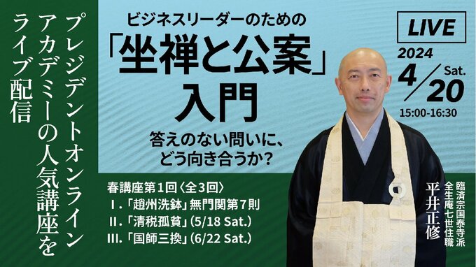 多くのビジネスリーダーのみなさまから大変ご好評をいただいております全生庵(東京・谷中)、平井正修住職による「坐禅と公案」の入門講座。ご参加のみなさまからのご要望にお応えし、2024年春の連続講座を開催いたします。