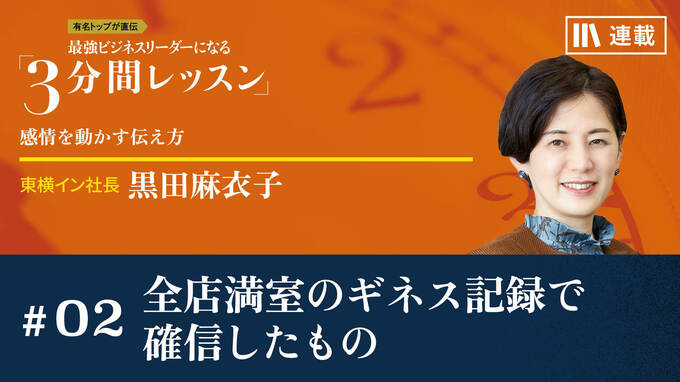 第2話 2024/4/8 月曜朝のエネルギー、全4回のレター 全店満室のギネス記録で確信したもの 心のアップグレード 3分間レッスン マネジメント リーダーシップ 「100%の稼働率を達成した最大のホテルチェーン」として2015年のギネス世界記録に認定された東横イン。業績不振から一転しての記録達成で、黒田社長が感じた会社の強さとは――。(2024年4月8日レター) 黒田 麻衣子 東横イン社長 聖心女子大学を卒業後、立教大学大学院でドイツ近代史を専攻。2002年東横イン入社。出産・育児のため退社後、08年に副社長として復帰。12年に社長就任。運営する東横INNは国内最大級の客室数を有するホテルチェーン。20年「第40回毎日経済人賞」受賞。