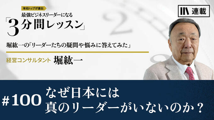 第100話 2024/4/22 月曜朝のエネルギー、レジェンドから見た未来 なぜ日本には真のリーダーがいないのか? 心のアップグレード 3分間レッスン マネジメント リーダーシップ 本連載では、“伝説のトップコンサルタント”堀紘一氏に、メルマガ編集チームがまとめたリーダーたちの悩みをぶつけ、ズバッと斬っていただきます。(2024年4月22日レター) 堀 紘一 経営コンサルタント 1945年、兵庫県生まれ。東京教育大学(現筑波大学)附属駒場高校(筑駒)、東京大学法学部を卒業。読売新聞社、三菱商事を経て、米ハーバード大学ビジネススクールでMBAを首席で卒業。81年、ボストン コンサルティング グループ(BCG)に入社、89年から日本支社社長。2000年6月にドリームインキュベータ(DI)を設立し、社長、会長を歴任。20年6月に取締役を退任。