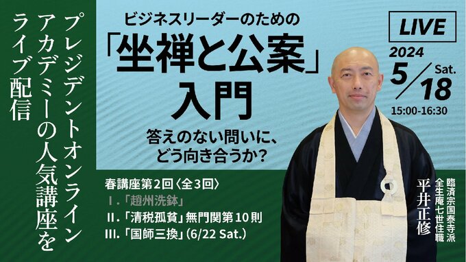 多くのビジネスリーダーのみなさまから大変ご好評をいただいております全生庵(東京・谷中)、平井正修住職による「坐禅と公案」の入門講座。ご参加のみなさまからのご要望にお応えし、2024年春の連続講座を開催いたします。