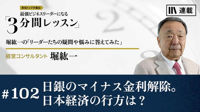 第102話 2024/5/13 月曜朝のエネルギー、レジェンドから見た未来 日銀のマイナス金利解除。日本経済の行方は? 心のアップグレード 3分間レッスン マネジメント リーダーシップ 本連載では、“伝説のトップコンサルタント”堀紘一氏に、メルマガ編集チームがまとめたリーダーたちの悩みをぶつけ、ズバッと斬っていただきます。(2024年5月13日レター) 堀 紘一 経営コンサルタント 1945年、兵庫県生まれ。東京教育大学(現筑波大学)附属駒場高校(筑駒)、東京大学法学部を卒業。読売新聞社、三菱商事を経て、米ハーバード大学ビジネススクールでMBAを首席で卒業。81年、ボストン コンサルティング グループ(BCG)に入社、89年から日本支社社長。2000年6月にドリームインキュベータ(DI)を設立し、社長、会長を歴任。20年6月に取締役を退任。
