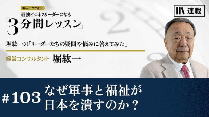 第103話 2024/5/20 月曜朝のエネルギー、レジェンドから見た未来 なぜ軍事と福祉が日本を潰すのか? 心のアップグレード 3分間レッスン マネジメント リーダーシップ 本連載では、“伝説のトップコンサルタント”堀紘一氏に、メルマガ編集チームがまとめたリーダーたちの悩みをぶつけ、ズバッと斬っていただきます。(2024年5月20日レター) 堀 紘一 経営コンサルタント 1945年、兵庫県生まれ。東京教育大学(現筑波大学)附属駒場高校(筑駒)、東京大学法学部を卒業。読売新聞社、三菱商事を経て、米ハーバード大学ビジネススクールでMBAを首席で卒業。81年、ボストン コンサルティング グループ(BCG)に入社、89年から日本支社社長。2000年6月にドリームインキュベータ(DI)を設立し、社長、会長を歴任。20年6月に取締役を退任。