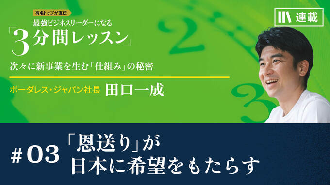 第3話 2024/6/17 月曜朝のエネルギー、全4回のレター 「恩送り」が日本に希望をもたらす 心のアップグレード 3分間レッスン マネジメント リーダーシップ 昨年、ボーダレス・ジャパンは新しいパーパスを発表しました。そこには課題先進国と位置付けられる日本に対する田口社長の強い思いがありました。(2024年6月17日レター) 田口 一成 ボーダレス・ジャパン社長 1980年生まれ。福岡県出身。早稲田大学在学中に米国ワシントン大学へ留学。卒業後、ミスミを経て25歳で独立し、ボーダレス・ジャパンを創業。現在、世界14カ国で51のソーシャルビジネスを展開し、従業員は約1500名、2023年度の売上は86億円を超える。「グッドデザイン賞」、「日本でいちばん大切にしたい会社大賞」受賞。日経ビジネス「世界を動かす日本人50」、Forbes JAPAN「日本のインパクト・アントレプレナー35」などに選出される。