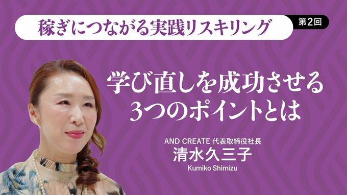 リスキリングを成功させるには、いくつかのポイントとなる資質があります。自分のキャリアや人生における様々な出来事=点と点を、自分にとってよい出来事として結んでいくことで、自分で自分の物語をつくる力もそのひとつ。5人の事例とともに、成功のための要因と、失敗しがちなパターンと対応策を学びます。