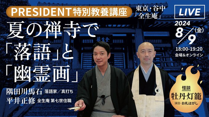 2023年夏にも開催し、多くのみなさまにご参加をいただきました全生庵での「落語と幽霊画」の教養講座。ご好評を受け、本年は落語の演目を「怪談 牡丹灯籠」に替え、またご紹介する貴重な幽霊画も、一部を入れ替えての講座開催のご案内です。
