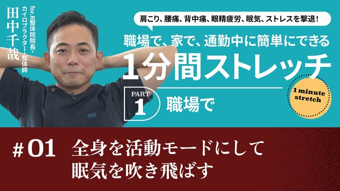 職場で簡単にできる眠気覚ましのストレッチをご紹介します。1分間ストレッチによって血行がよくなれば頭がスッキリし、朝から仕事の効率も上がります。今回は「かかと上げ」「ツイスト」「広背筋ストレッチ」をご紹介します。動画を見ながら、真似して体を動かしてみましょう。