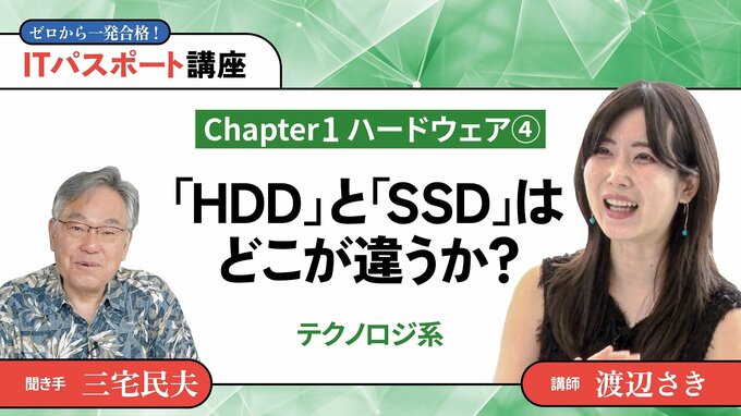 データを保持するための装置が、「記憶装置」です。コンピュータの記憶装置は、主記憶装置と補助記憶装置の2つに大別されます。主記憶装置(メインメモリ)は、データを一時的に保存します。一方、補助記憶装置(ストレージ)は、データの長期の保管が可能です。補助記憶装置のハードディスクとSSDの違いについても学びます。
