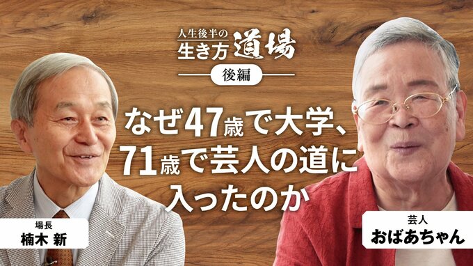 おばあちゃんの人生は、苦難の連続だった。「大学に行きたい」という夢を持っていたが、親に反対されて中学卒業後、就職。働いてお金をためながら、通信教育で高校、短大、大学で学んだ。38歳のとき、乳がんの末期状態で手術、転移して入退院を8年間、繰り返した。64歳のとき、膝が壊死して手術。リハビリで脳裏に浮かんだのが、「お笑い」だった。小学生の頃にラジオで中田ダイマル・ラケットのしゃべくり漫談を聞き、「道具を何も持たないで、人を笑わせるってすごい」と感じていたことを思い出したのだ。やりたいと思ったことは、「あきらめずに、チャンスがあったらする」。粘り強く、やりたいことに挑戦し続けるパワーは、どこから来ているのか。おばあちゃんのパワーの源を探る後編。