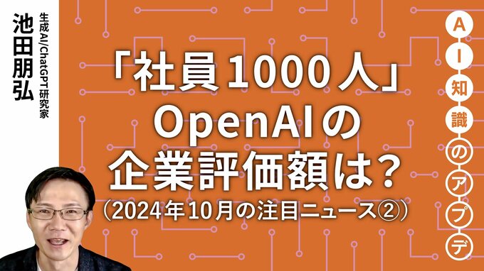 2024/10/13 2024年10月のアップデート 【注目のニュース②】「社員1000人」OpneAIの企業評価額は? 技のアップグレード 動画 無料 デジタルスキル・DX オープンAIが66億ドル(約9600億円)の資金調達をしました。企業評価額は1570億ドルに膨らみ、日立製作所を上回る規模に。巨額の調達で、生成AIの開発競争はどう変わっていくのか、ビジネスパーソンが着目すべきことは何かを解説します。 池田 朋弘 生成AI/ChatGPT研究家 Workstyle Evolution代表取締役。早稲田大学卒業後、複数企業を創業。また創業者・経営者として4回のM&Aを経験。著書に『ChatGPT最強の仕事術』など。 本編