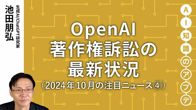 OpenAIが著作権訴訟を受けて、AI訓練データの検証を許可する方針です。検証は、訴訟を起こしている書籍の著者らの代理人によって行われます。その最新の状況と、生成AIによって作られたアウトプットをビジネスで活用する際の注意点について、じっくり解説します。