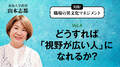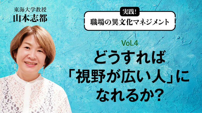 第4話 2024/11/4 実践!職場の異文化マネジメント どうすれば「視野が広い人」になれるか? 心のアップグレード 動画 ビジネス心理 マネジメント コミュニケーション 「日本は狭い島国」と言ったとき、比較対象とするのはどの国でしょうか?多様な人が集まる職場では、物事を一つの尺度で「絶対化」するのではなく、「相対化」できる広い視野が必要です。いくつかのエクササイズをいれながら、「相対化」するための講義をします。 山本 志都 東海大学文学部英語文化コミュニケーション学科教授 上智大学大学院総合人間科学研究科博士後期課程修了、博士(教育学)、ポートランド州立大学スピーチ・コミュニケーション研究科修士課程修了、修士。主な著書に、『異文化間協働におけるコミュニケーション―相互作用の学習体験化および組織と個人の影響の実証的研究』(ナカニシヤ出版)、『異文化コミュニケーションワークブック』(共著、三修社)、『異文化コミュニケーション・トレーニング』(共著、三修社)。 本編の一部公開版