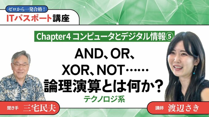 第20話 2024/12/16 ◎テクノロジ系 【Chapter4】コンピュータとデジタル情報5AND、OR、XOR、NOT⋯⋯論理演算とは何か? 技のアップグレード 動画 デジタルスキル・DX 論理演算は、真理値(真偽値)などコンピュータの電子回路の設計を行うときなどに利用されます。2つの入力値に何らかの操作が行われたとき、どんな出力値が得られるのかを演算します。 渡辺 さき 情報学講師 すきまデザイン代表。東京都立大学理学部化学科卒業後、リクルートに入社し、6年半マーケティング職に従事した。東進ハイスクール講師(ITパスポート試験、高校情報科)。YouTube「ITすきま教室」や、フリーナレーターとしてイベント、展示会でも活躍中。 本編の一部公開版