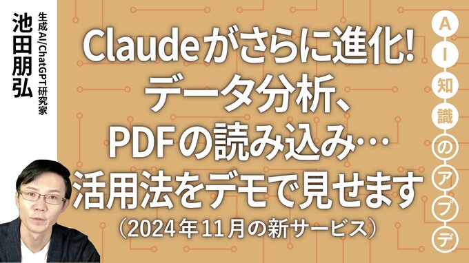 AIサービスのClaudeに注目の新機能が追加されました。その一つが、データを分析して、視覚的にリポートを作成する機能。もう一つが、PDFファイルの文章だけでなく、画像・グラフ・チャートも読み込む機能。池田朋弘さんが「ビジネスでのAI活用の幅がグッと広がった」という新機能について、具体的にデモしながら解説します。