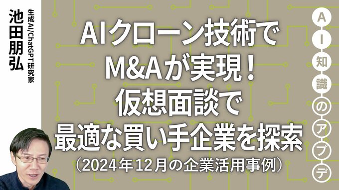 「注目の生成AI活用事例」は、どのように生成AIをビジネスで使ったらよいのかを企業の活用事例を通して学んでいきます。12月のトピックは、『世界初、AIクローン技術によるM&Aが実現』、『パナソニックが「松下幸之助再現AI」を発表』、『大林組がAIツールで建築設計の未来を描く』の3本です。