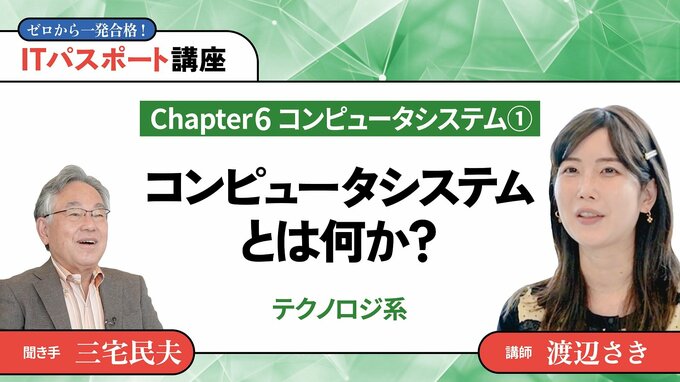 第27話 2025/1/20 ◎テクノロジ系 【Chapter6】コンピュータシステム1コンピュータシステムとは何か? 技のアップグレード 動画 デジタルスキル・DX システムとは、特定の目的を達成するために複数の要素が作用して稼働するものです。コンピュータは、システムの一部として機能します。ITインフラストラクチャとは、ITシステムの基盤を形成するものの総称です。 渡辺 さき 情報学講師 すきまデザイン代表。東京都立大学理学部化学科卒業後、リクルートに入社し、6年半マーケティング職に従事した。東進ハイスクール講師(ITパスポート試験、高校情報科)。YouTube「ITすきま教室」や、フリーナレーターとしてイベント、展示会でも活躍中。 本編の一部公開版
