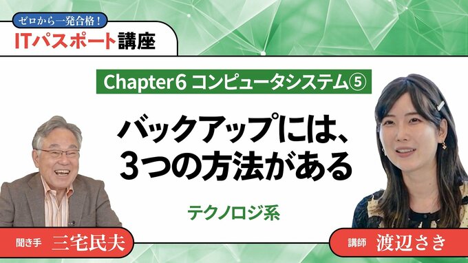 第31話 2025/2/3 ◎テクノロジ系 【Chapter6】コンピュータシステム5バックアップには、3つの方法がある 技のアップグレード 動画 デジタルスキル・DX バックアップとは、データを別の場所にコピーして保存すること。RAIDとは、複数のハードディスクを組み合わせ、仮想的に1つのハードディスクとして扱う技術です。 渡辺 さき 情報学講師 すきまデザイン代表。東京都立大学理学部化学科卒業後、リクルートに入社し、6年半マーケティング職に従事した。東進ハイスクール講師(ITパスポート試験、高校情報科)。YouTube「ITすきま教室」や、フリーナレーターとしてイベント、展示会でも活躍中。 本編の一部公開版