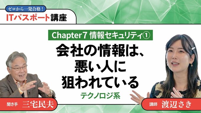 第32話 2025/2/10 ◎テクノロジ系 【Chapter7】情報セキュリティ1会社の情報は、悪い人に狙われている 技のアップグレード 動画 デジタルスキル・DX 情報セキュリティは、企業や個人が持つ大切な情報資産を保護する取り組み。不正アクセスとは、許可されていない人がコンピュータシステムやネットワークにアクセスする行為です。 渡辺 さき 情報学講師 すきまデザイン代表。東京都立大学理学部化学科卒業後、リクルートに入社し、6年半マーケティング職に従事した。東進ハイスクール講師(ITパスポート試験、高校情報科)。YouTube「ITすきま教室」や、フリーナレーターとしてイベント、展示会でも活躍中。 本編の一部公開版