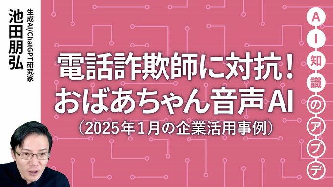 「注目の生成AI活用事例」は、どのように生成AIをビジネスで使ったらよいのかを企業の活用事例を通して学んでいきます。1月のトピックは、『電話詐欺師に対抗するおばあちゃん音声AI「Daisy」』、『GMOが社内用AIツール「AI熊谷正寿」を開発』、『生成AI活用で1人あたり売上140%アップに成功』の3本です。