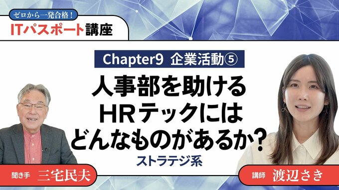 第48話 2025/4/21 ◎ストラテジ系 【Chapter9】企業活動5人事部を助けるHRテックにはどんなものがあるか? 技のアップグレード 動画 デジタルスキル・DX 企業の人事は、企業全体の人材戦略を担当します。HRテックとは、人材管理業務を効率化するためのIT技術です。社員教育でのスキル習得には、大きく分けてOJTとOff-JTの2つのパターンがあります。 渡辺 さき 情報学講師 すきまデザイン代表。東京都立大学理学部化学科卒業後、リクルートに入社し、6年半マーケティング職に従事した。東進ハイスクール講師(ITパスポート試験、高校情報科)。YouTube「ITすきま教室」や、フリーナレーターとしてイベント、展示会でも活躍中。 本編の一部公開版