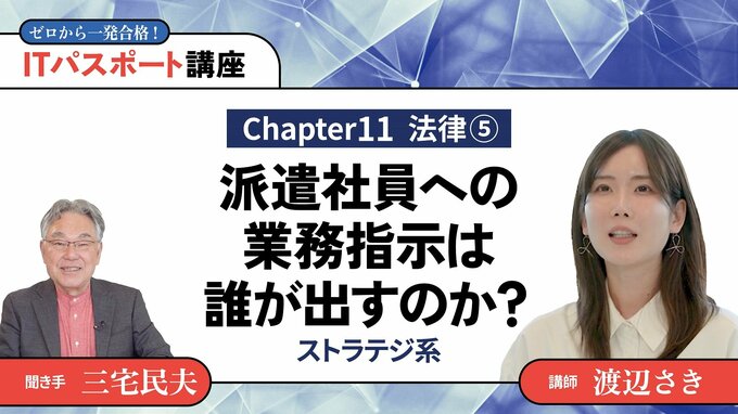 第59話 2025/6/2 ◎ストラテジ系 【Chapter11】法律5派遣社員への業務指示は誰が出すのか? 技のアップグレード 動画 デジタルスキル・DX 労働基準法とは、労働者の権利を保護するための法律。雇用契約には、直接雇用と間接雇用があります。間接雇用は労働者派遣契約と請負契約に分類されます。 渡辺 さき 情報学講師 すきまデザイン代表。東京都立大学理学部化学科卒業後、リクルートに入社し、6年半マーケティング職に従事した。東進ハイスクール講師(ITパスポート試験、高校情報科)。YouTube「ITすきま教室」や、フリーナレーターとしてイベント、展示会でも活躍中。 本編の一部公開版
