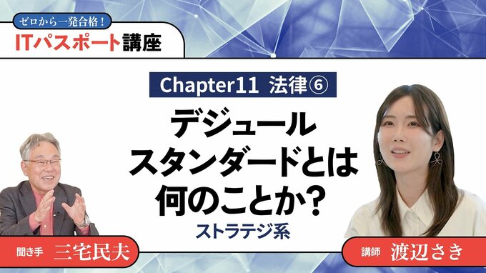 第60話 2025/6/9 ◎ストラテジ系 【Chapter11】法律6デジュールスタンダードとは何のことか? 技のアップグレード 動画 デジタルスキル・DX 標準化とは、規格を統一すること。デジュールスタンダード、フォーラム標準、デファクトスタンダードについて学びます。 渡辺 さき 情報学講師 すきまデザイン代表。東京都立大学理学部化学科卒業後、リクルートに入社し、6年半マーケティング職に従事した。東進ハイスクール講師(ITパスポート試験、高校情報科)。YouTube「ITすきま教室」や、フリーナレーターとしてイベント、展示会でも活躍中。 本編の一部公開版