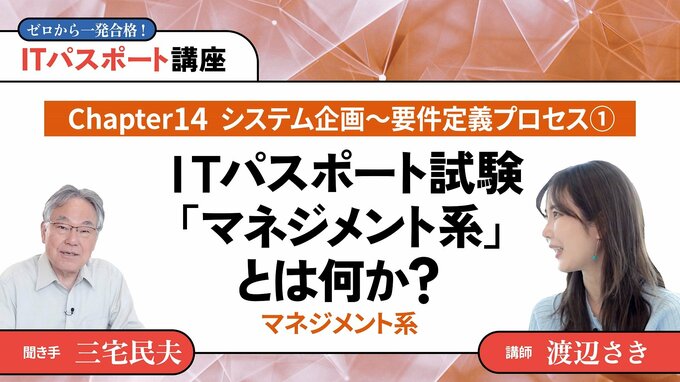第72話 2025/8/11 ◎マネジメント系 【Chapter14】システム企画〜要件定義プロセス1ITパスポート試験「マネジメント系」とは何か? 技のアップグレード 動画 デジタルスキル・DX マネジメント系では、企業でシステム開発を行うための業務について学びます。ソフトウェアライフサイクルプロセスは、ソフトウェアの企画段階からシステム廃棄に至るまでの業務工程です。 渡辺 さき 情報学講師 すきまデザイン代表。東京都立大学理学部化学科卒業後、リクルートに入社し、6年半マーケティング職に従事した。東進ハイスクール講師(ITパスポート試験、高校情報科)。YouTube「ITすきま教室」や、フリーナレーターとしてイベント、展示会でも活躍中。 本編の一部公開版