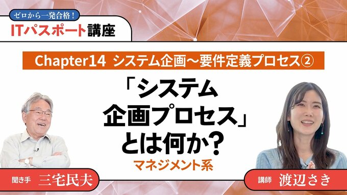 第73話 2025/8/18 ◎マネジメント系 【Chapter14】システム企画〜要件定義プロセス2「システム企画プロセス」とは何か? 技のアップグレード 動画 デジタルスキル・DX 企画プロセスは、新しいシステムを開発・導入する際のシステム化の方針と実施計画をまとめる業務です。システム化構想プロセスとシステム化計画プロセスの2つからなります。 渡辺 さき 情報学講師 すきまデザイン代表。東京都立大学理学部化学科卒業後、リクルートに入社し、6年半マーケティング職に従事した。東進ハイスクール講師(ITパスポート試験、高校情報科)。YouTube「ITすきま教室」や、フリーナレーターとしてイベント、展示会でも活躍中。 本編の一部公開版