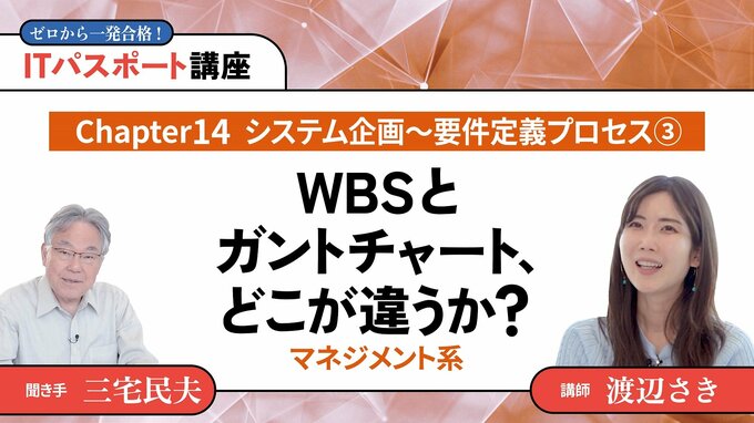 第74話 2025/8/25 ◎マネジメント系 【Chapter14】システム企画〜要件定義プロセス3WBSとガントチャート、どこが違うか? 技のアップグレード 動画 デジタルスキル・DX WBSは、作業(タスク)を分解して構造化した図。ガントチャートは、作業計画を可視化した図表。アローダイアグラムは、作業計画を立てるときに利用する手順を可視化した図です。 渡辺 さき 情報学講師 すきまデザイン代表。東京都立大学理学部化学科卒業後、リクルートに入社し、6年半マーケティング職に従事した。東進ハイスクール講師(ITパスポート試験、高校情報科)。YouTube「ITすきま教室」や、フリーナレーターとしてイベント、展示会でも活躍中。 本編の一部公開版