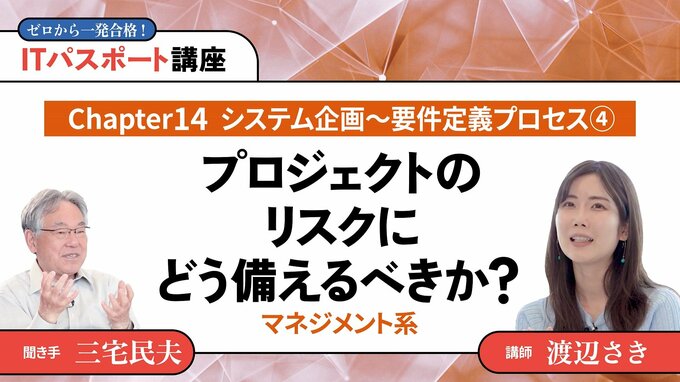 第75話 2025/8/25 ◎マネジメント系 【Chapter14】システム企画〜要件定義プロセス4プロジェクトのリスクにどう備えるべきか? 技のアップグレード 動画 デジタルスキル・DX リスク対応策では、リスクアセスメントで明確にしたリスクに対して、どのように対応するのかを決定します。リスク対応策は4項目あり、影響度の大小・発生確率の大小で方針を決定します。 渡辺 さき 情報学講師 すきまデザイン代表。東京都立大学理学部化学科卒業後、リクルートに入社し、6年半マーケティング職に従事した。東進ハイスクール講師(ITパスポート試験、高校情報科)。YouTube「ITすきま教室」や、フリーナレーターとしてイベント、展示会でも活躍中。 本編の一部公開版