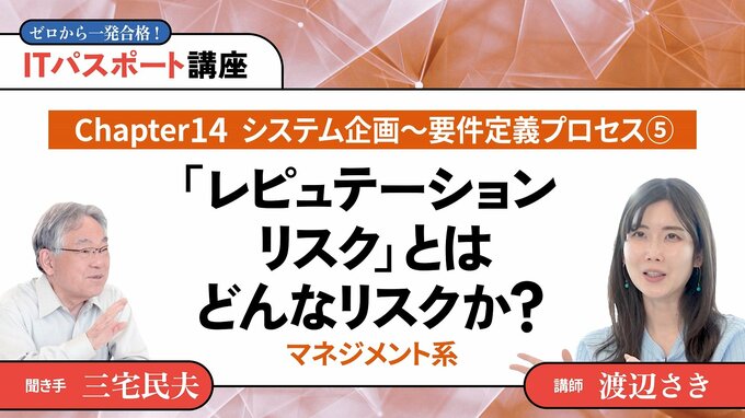 第76話 2025/9/1 ◎マネジメント系 【Chapter14】システム企画〜要件定義プロセス5「レピュテーションリスク」とはどんなリスクか? 技のアップグレード 動画 デジタルスキル・DX レピュテーションリスクとは、企業の評判が悪化することで生じる潜在的な経営リスクのこと。システム監査で企業やシステムを適正に評価し、是正に導きます。 渡辺 さき 情報学講師 すきまデザイン代表。東京都立大学理学部化学科卒業後、リクルートに入社し、6年半マーケティング職に従事した。東進ハイスクール講師(ITパスポート試験、高校情報科)。YouTube「ITすきま教室」や、フリーナレーターとしてイベント、展示会でも活躍中。 本編の一部公開版