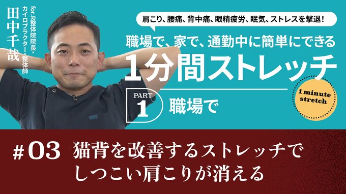 猫背や前かがみの姿勢を取り続けると、肩から背中の筋肉にじわじわと負担がかかり、肩こりの原因となります。今回は、猫背を改善する「胸開き」「ハンモックストレッチ」「バンザイ肩甲骨ストレッチ」をご紹介します。仕事の合間や休憩時間に、動画を見ながら、真似して体を動かしてみましょう。
