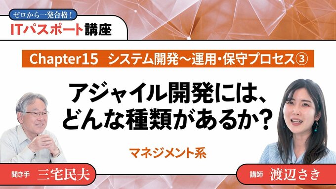第81話 2025/9/15 ◎マネジメント系 【Chapter15】システム開発〜運用・保守プロセス3アジャイル開発には、どんな種類があるか? 技のアップグレード 動画 デジタルスキル・DX ウォーターフォールモデルとは、最も古典的な技法で、現在も広く普及する開発手法。アジャイル開発は、常に改善を重ね、仕様変更にも柔軟に対応できる開発手法です。 渡辺 さき 情報学講師 すきまデザイン代表。東京都立大学理学部化学科卒業後、リクルートに入社し、6年半マーケティング職に従事した。東進ハイスクール講師(ITパスポート試験、高校情報科)。YouTube「ITすきま教室」や、フリーナレーターとしてイベント、展示会でも活躍中。 本編の一部公開版