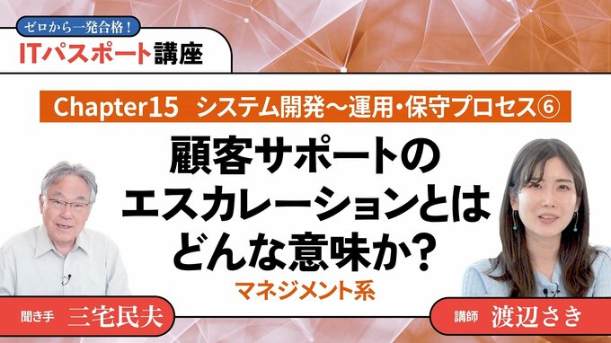第84話 2025/9/29 ◎マネジメント系 【Chapter15】システム開発〜運用・保守プロセス6顧客サポートのエスカレーションとはどんな意味か? 技のアップグレード 動画 デジタルスキル・DX サービスデスクでは、システムトラブルや、ソフトウェアの使い方、技術的な疑問など、広範囲な顧客対応を行います。SLAは、サービス提供者と利用者との間で、システムの品質を一定の条件以上に保つことに合意した品質定義のことです。 渡辺 さき 情報学講師 すきまデザイン代表。東京都立大学理学部化学科卒業後、リクルートに入社し、6年半マーケティング職に従事した。東進ハイスクール講師(ITパスポート試験、高校情報科)。YouTube「ITすきま教室」や、フリーナレーターとしてイベント、展示会でも活躍中。 本編の一部公開版