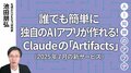 2025/7/20 2025年7月のアップデート 【最新の生成AIサービス】誰でも簡単に独自のAIアプリが作れる!Claudeの「Artifacts」 技のアップグレード 動画 無料 デジタルスキル・DX AI搭載のアプリをノーコードで作成できる機能がClaudeに登場しました。自分の業務に特化した独自のアプリを簡単に作れます。具体的な活用方法を池田朋弘さんがデモをまじえて詳しく解説します。 池田 朋弘 生成AI/ChatGPT研究家 Workstyle Evolution代表取締役。早稲田大学卒業後、複数企業を創業。また創業者・経営者として4回のM&Aを経験。著書に『ChatGPT最強の仕事術』など。 本編