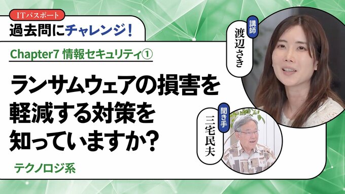 第107話 2025/12/15 ◎過去問にチャレンジ! 【テクノロジ系】ランサムウェアの損害を軽減する対策を知っていますか? 技のアップグレード 動画 デジタルスキル・DX ランサムとは、身代金を意味します。ユーザのシステム利用を制限した後、解除方法を提供する代わりに身代金を要求するマルウェアの一種がランサムウェアです。 渡辺 さき 情報学講師 すきまデザイン代表。東京都立大学理学部化学科卒業後、リクルートに入社し、6年半マーケティング職に従事した。東進ハイスクール講師(ITパスポート試験、高校情報科)。YouTube「ITすきま教室」や、フリーナレーターとしてイベント、展示会でも活躍中。 本編の一部公開版