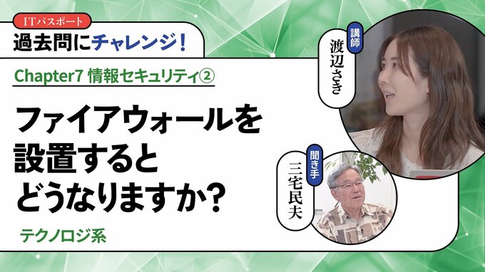第108話 2025/12/15 ◎過去問にチャレンジ! 【テクノロジ系】ファイアウォールを設置するとどうなりますか? 技のアップグレード 動画 デジタルスキル・DX ファイアウォールとは、ネットワークを利用した不正アクセスによる侵入から情報を守る仕組みです。あらかじめ通信を許可する通信の種類を指定し、それ以外の通信を遮断します。 渡辺 さき 情報学講師 すきまデザイン代表。東京都立大学理学部化学科卒業後、リクルートに入社し、6年半マーケティング職に従事した。東進ハイスクール講師(ITパスポート試験、高校情報科)。YouTube「ITすきま教室」や、フリーナレーターとしてイベント、展示会でも活躍中。 本編の一部公開版