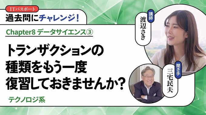 第113話 2025/12/29 ◎過去問にチャレンジ! 【テクノロジ系】トランザクションの種類をもう一度復習しておきませんか? 技のアップグレード 動画 デジタルスキル・DX トランザクションとは、コンピュータの世界で一連の操作を1つの処理単位として扱い、全部成功するか、もしくは全部なかったことにするかという処理方式です。 渡辺 さき 情報学講師 すきまデザイン代表。東京都立大学理学部化学科卒業後、リクルートに入社し、6年半マーケティング職に従事した。東進ハイスクール講師(ITパスポート試験、高校情報科)。YouTube「ITすきま教室」や、フリーナレーターとしてイベント、展示会でも活躍中。 本編の一部公開版