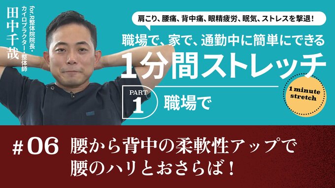 腰から背中の柔軟性が低下すると、腰痛の原因となります。今回ご紹介する職場でできるストレッチは、骨盤を正しい位置にリセットする「背中丸め&反らし」と、腰から背中、腕につながる大きな筋肉広背筋を伸ばす「広背筋ストレッチ」。動画を見ながら真似して体を動かしてみましょう。
