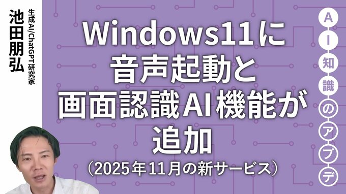 2025/11/23 今月のアップデート 【最新の生成AIサービス①】Windows11に音声起動と画面認識AI機能が追加 技のアップグレード 動画 無料 デジタルスキル・DX Windows11の音声でAIを呼び出せる「Hey Copilot」機能と、画面内容をAIが読み取り操作を補助する「Copilot Vison」について、詳しく解説します。 池田 朋弘 生成AI/ChatGPT研究家 Workstyle Evolution代表取締役。早稲田大学卒業後、複数企業を創業。また創業者・経営者として4回のM&Aを経験。著書に『ChatGPT最強の仕事術』など。 本編