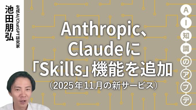 2025/11/23 今月のアップデート 【最新の生成AIサービス②】Anthropic、Claudeに「Skills」機能を追加 技のアップグレード 動画 無料 デジタルスキル・DX Claudeの「Skills」機能では、資料作成やExcel整理などで自社の定型化されたフォーマットに仕上げることができます。具体的な活用方法を詳しく解説します。 池田 朋弘 生成AI/ChatGPT研究家 Workstyle Evolution代表取締役。早稲田大学卒業後、複数企業を創業。また創業者・経営者として4回のM&Aを経験。著書に『ChatGPT最強の仕事術』など。 本編